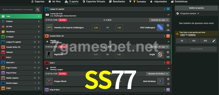 O SS77 oferece uma grande seleção de opções de apostas em e-sports com probabilidades competitivas